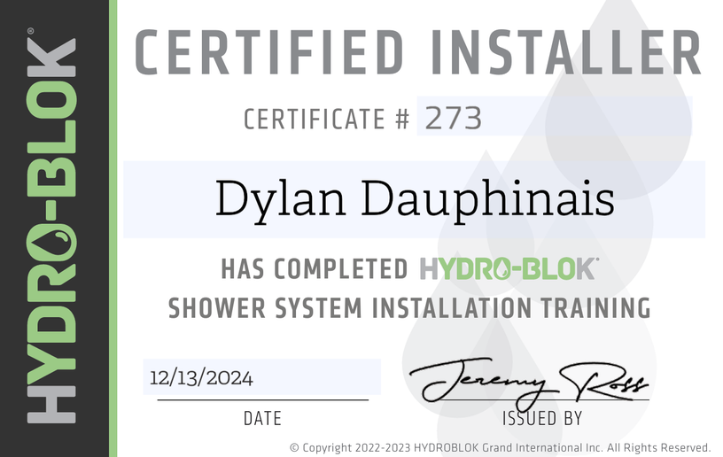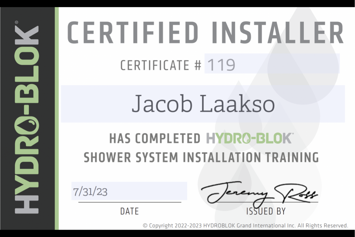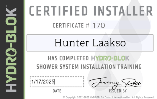 Our Team is a certified and recognized Hydro-Blok Installer. This waterproof membrane will be sure to last and hold up in any shower application.